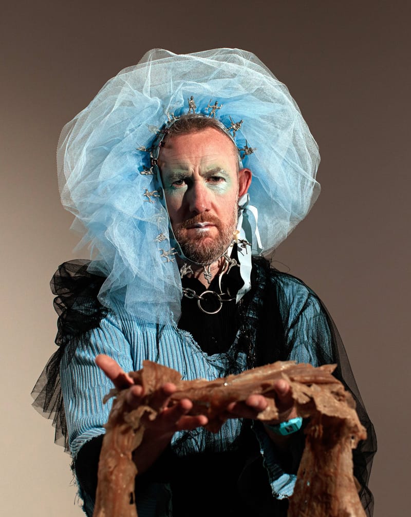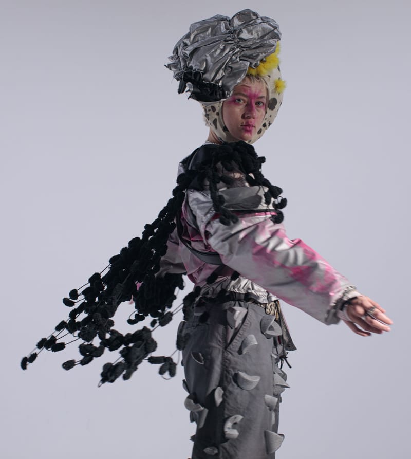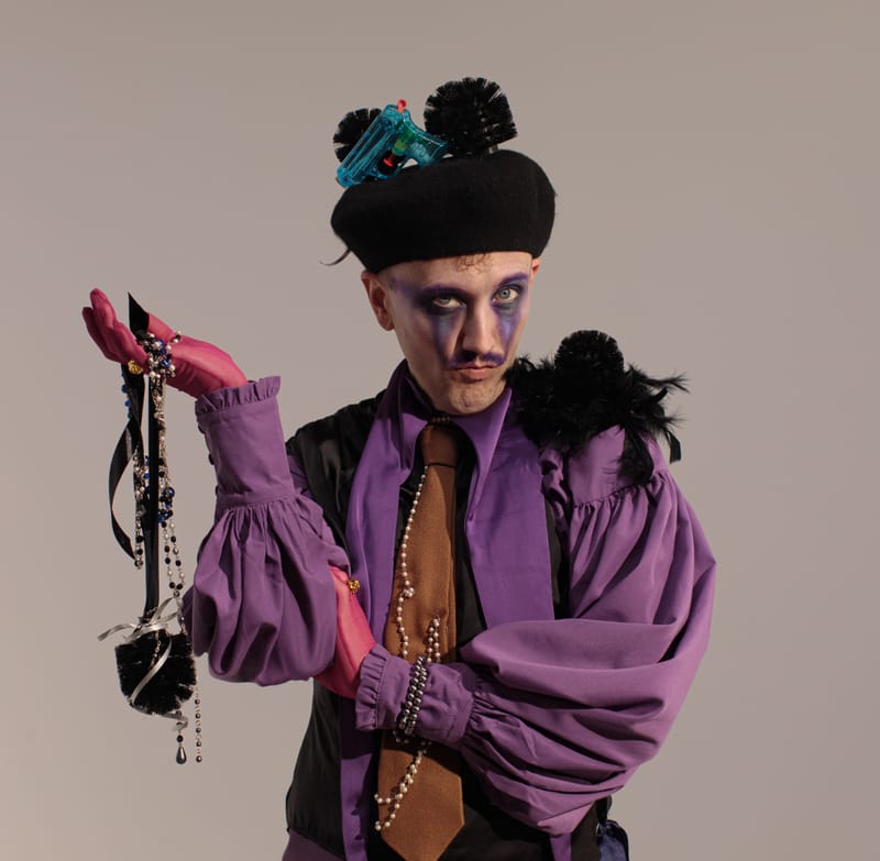 I altered, painted and refashioned every item, mostly purchased from local charity shops & Vinted, none from fast fashion companies. Some items were scripted (cape made of cable ties, furry trousers, cheese shoes etc) and other aspects I had creative freedom to create. I particularly wanted to play with texture on screen to create a hectic world full of fashion being treated very earnestly, while the viewer can recognise everyday/childhood objects (toys, toilet brushes, swimming armbands etc)