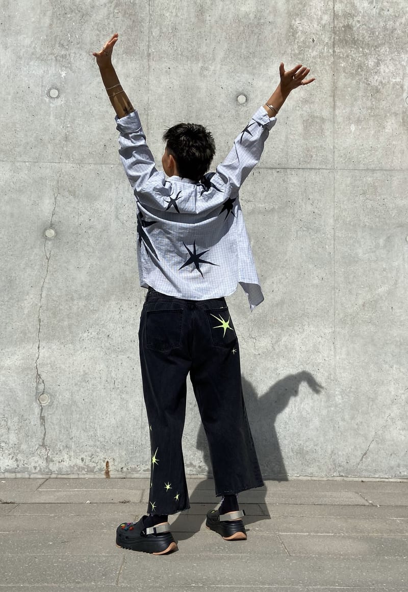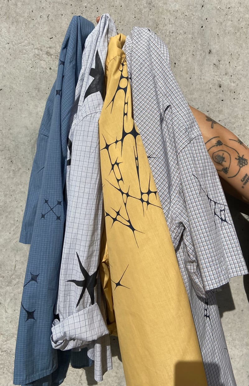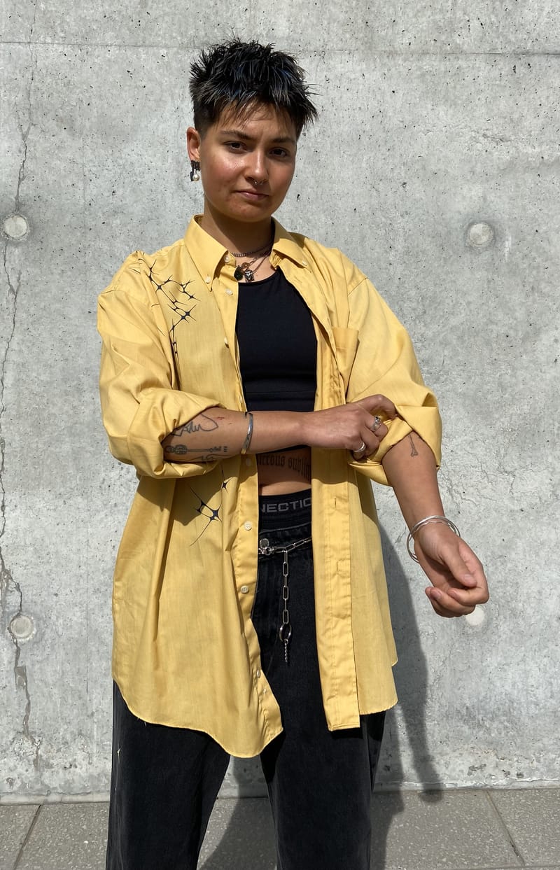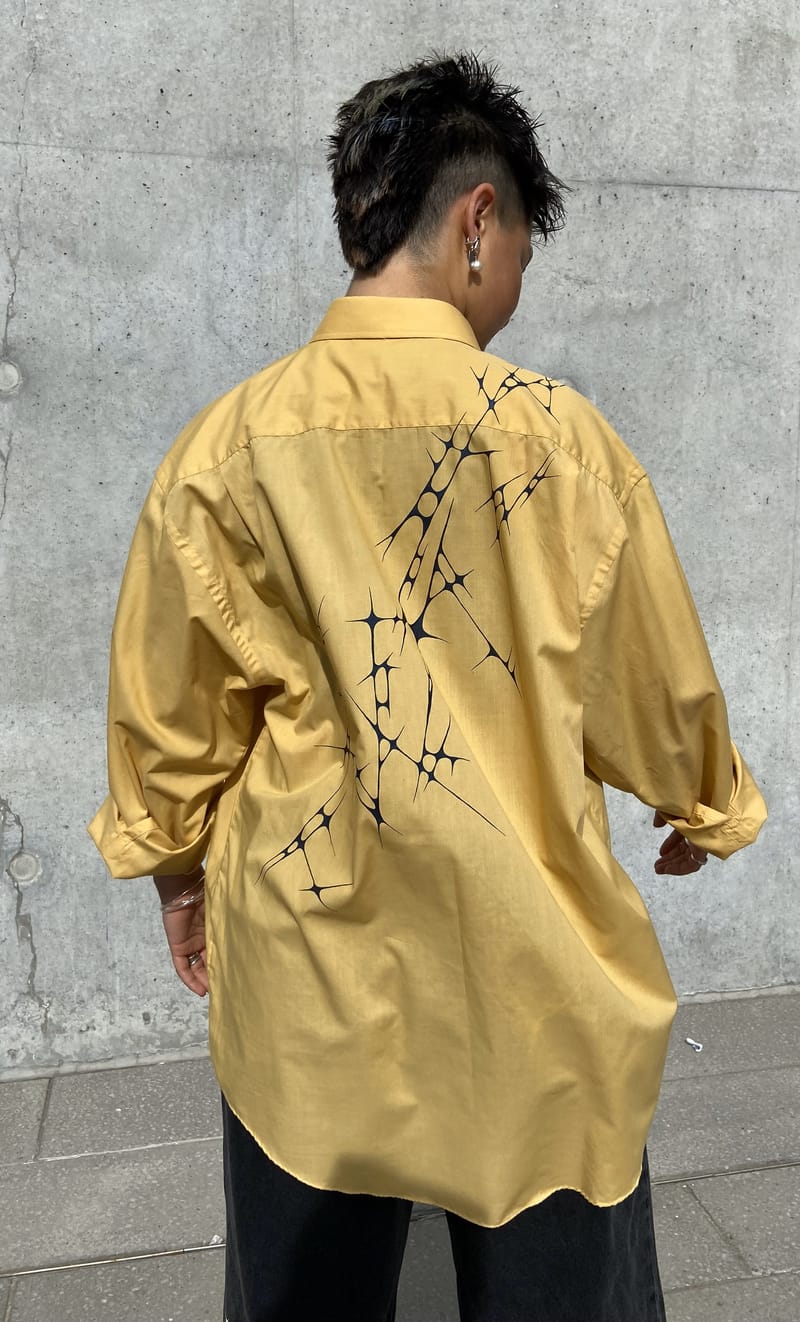 I paint 2nd hand shirts with spikey shapes, drawing inspiration from the adoption of office-wear and oversized shirts into dyke-coded fashion.