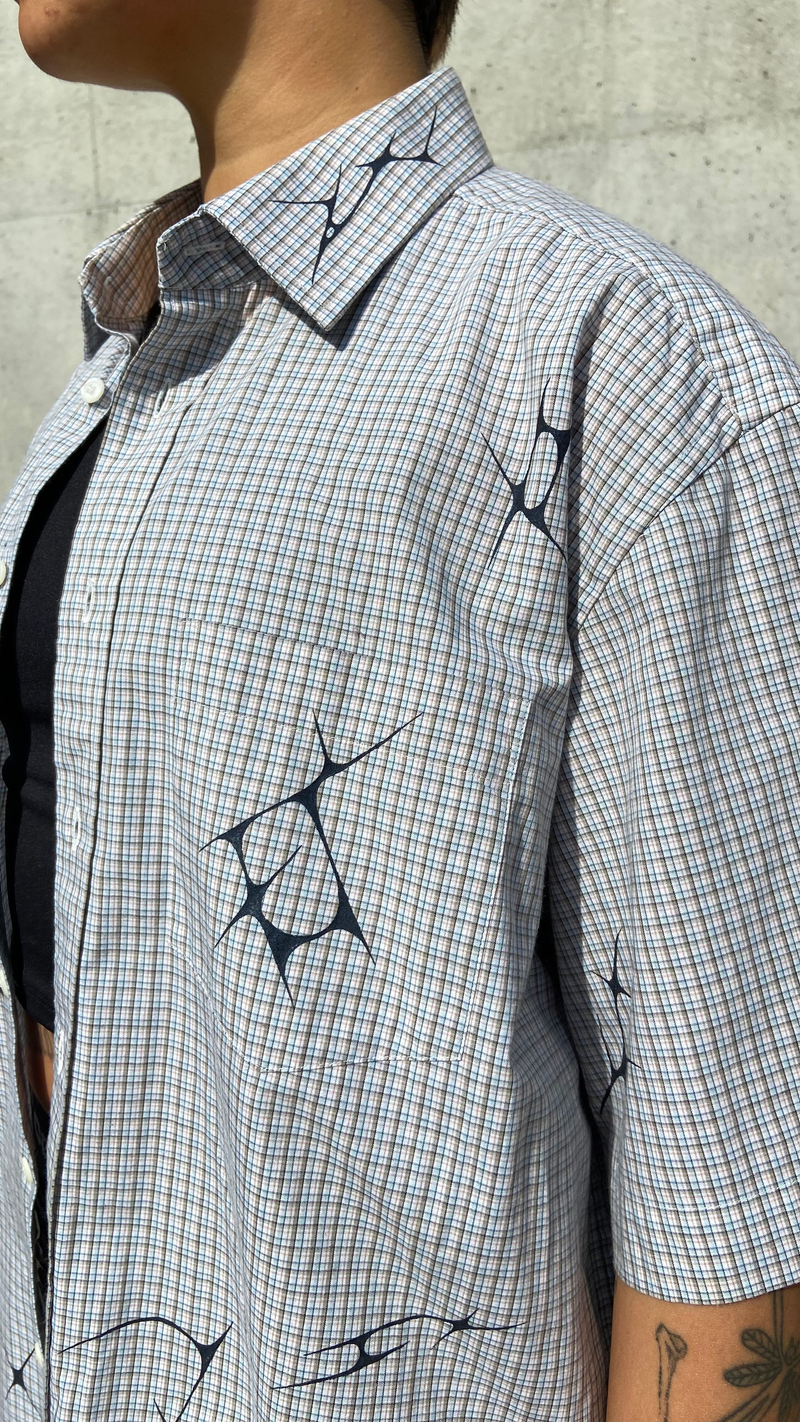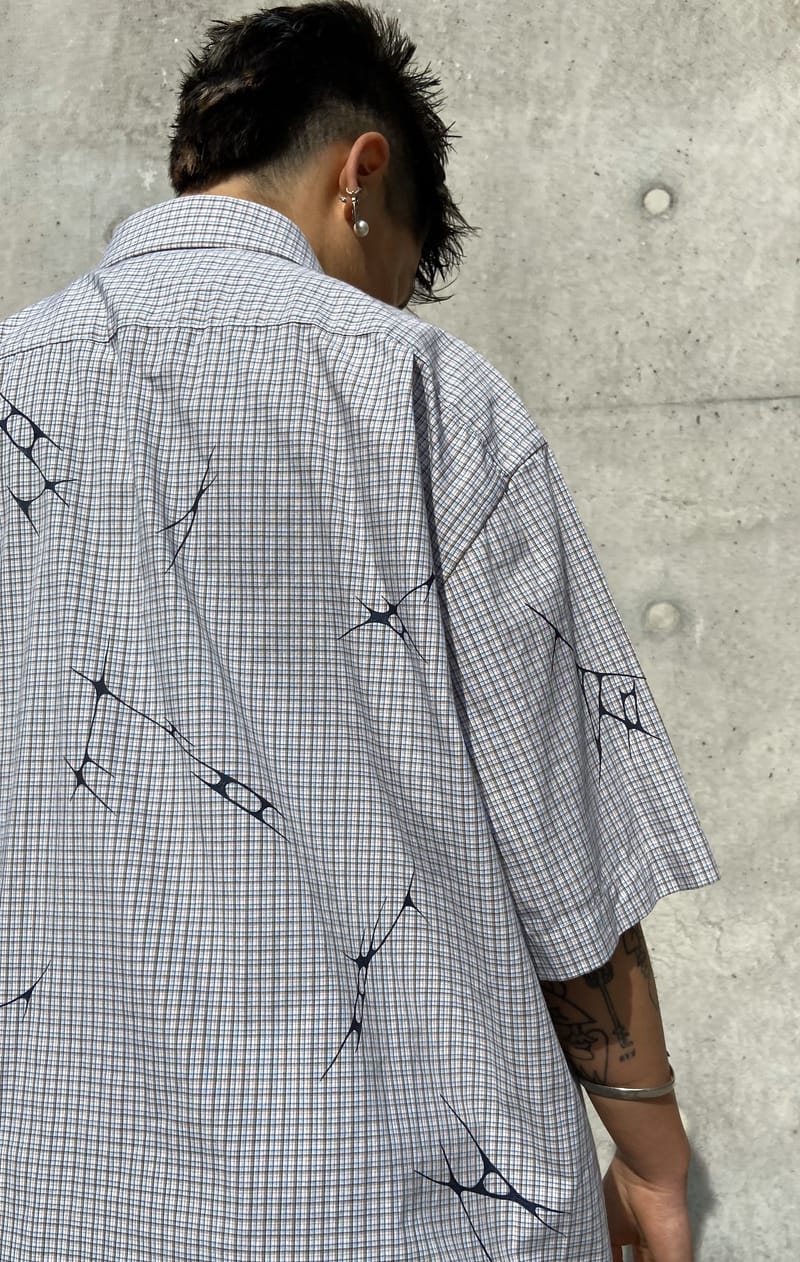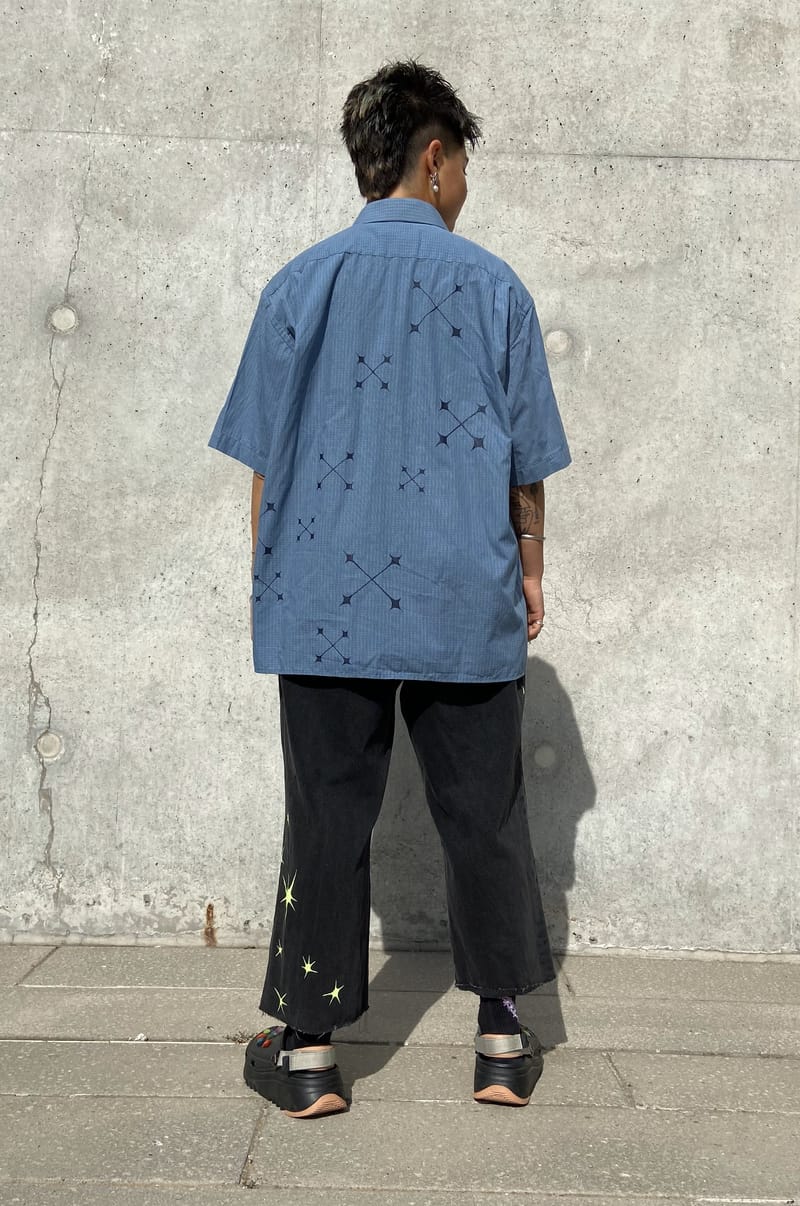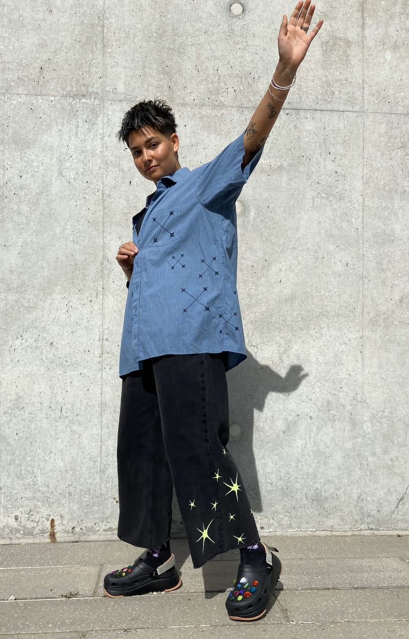 I paint 2nd hand shirts with spikey shapes, drawing inspiration from the adoption of office-wear and oversized shirts into dyke-coded fashion.
